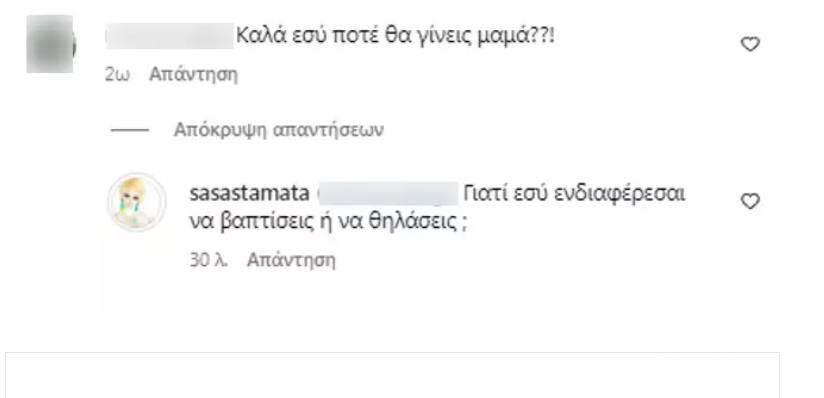 Κάτω από την ανάρτηση, μία ακόλουθός της αναρωτήθηκε πότε η δημοσιογράφος θα γίνει μαμά, ρωτώντας «Καλά εσύ πότε θα γίνεις μαμά;», με τη δημοσιογράφο να απαντάει «Γιατί εσύ ενδιαφέρεσαι να βαπτίσεις ή να θηλάσεις;».