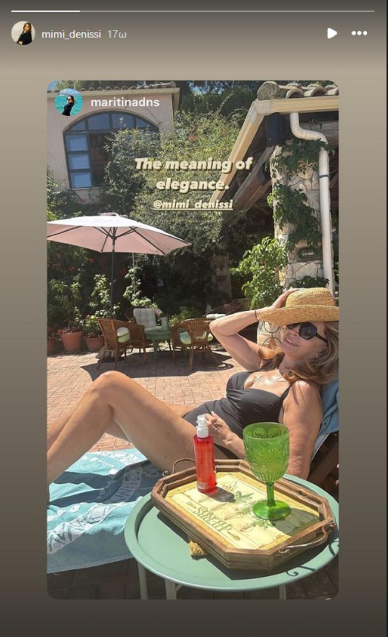 Η Μαριτίνα δημοσίευσε σε Story στο Instagram μια φωτογραφία με την μητέρα της να ποζάρει καθισμένη στη βεράντα. Η 71χρονη ηθοποιός φοράει ένα μαύρο ολόσωμο μαγιό με ανοιχτό ντεκολτέ, σκουρόχρωμα γυαλιά ηλίου κρατώντας ένα ψάθινο καπέλο.