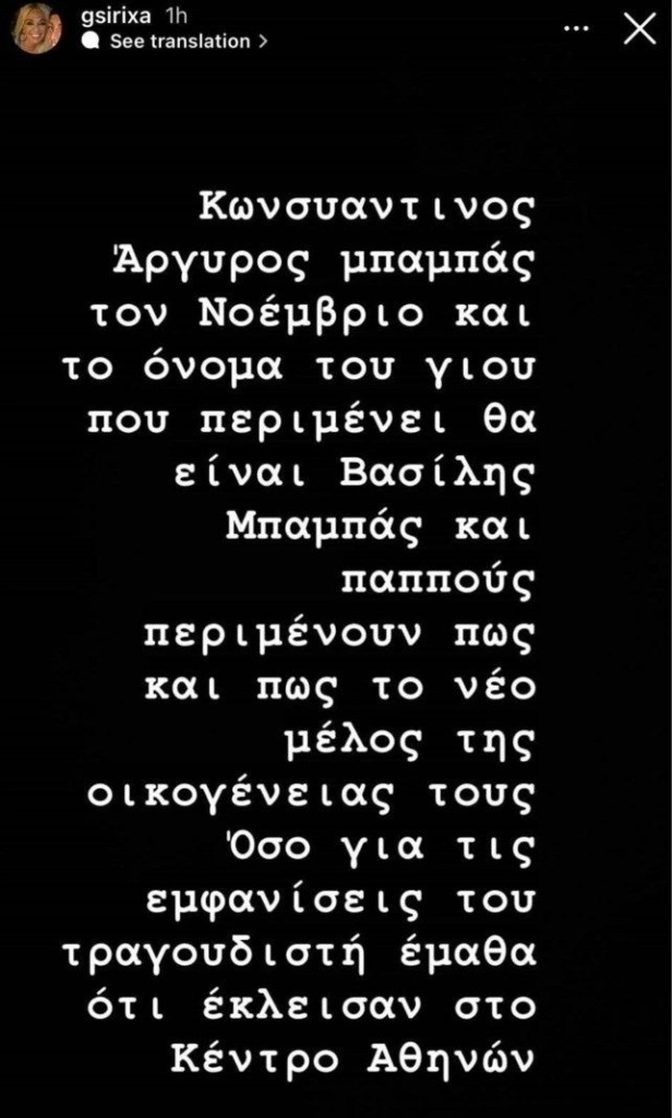 Σύμφωνα με τη δημοσιογράφο Τζώρτζια Συρίχα, η Αλεξάνδρα πρόκειται να γεννήσει τον Νοέμβριο. Η ίδια μάλιστα αποκάλυψε μέσω instastory και το όνομα του γιου του τραγουδιστή: “Κωνσταντίνος Αργυρός μπαμπάς τον Νοέμβριο και το όνομα του γιου που περιμένει θα είναι Βασίλης. Μπαμπάς και παππούς περιμένουν πώς και πώς το νέο μέλος της οικογένειάς του. Όσο για τις εμφανίσεις του τραγουδιστή έμαθα ότι έκλεισαν στο Κέντρο Αθηνών”.