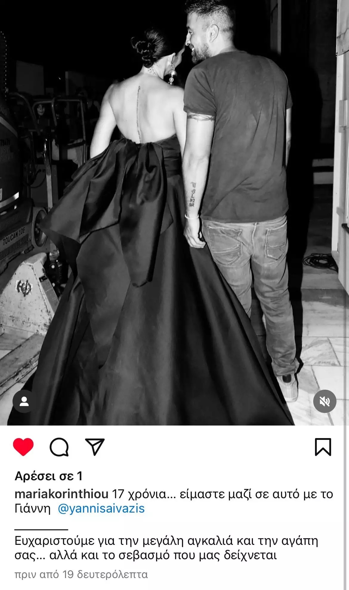 «17 χρόνια… είμαστε μαζί σε αυτό με το Γιάννη @yannisaivazis…Ευχαριστούμε για την μεγάλη αγκαλιά και την αγάπη σας… αλλά και το σεβασμό που μας δείχνεται» έγραψε χαρακτηριστικά η Μαρία Κορινθίου στην ανάρτησή της.