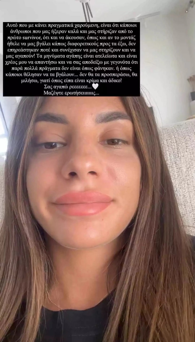 Κατόπιν η Μαριαλένα Ρουμελιώτη δημοσίευσε ένα Instagram story στο οποίο ανέφερε: «Αυτό που με κάνει πραγματικά χαρούμενη είναι ότι κάποιοι άνθρωποι που μας ήξεραν καλά και μας στήριζαν από το πρώτο Survivor, ό,τι και να άκουσαν, όπως και αν το μοντάζ ήθελε να μας βγάλει κάπως διαφορετικούς προς τα έξω, δεν επηρεάστηκαν ποτέ και συνέχισαν να μας στηρίζουν και να μας αγαπούν! Τα μηνύματα αγάπης είναι ατελείωτα και είναι χρέος μου να απαντήσω και να σας αποδείξω με γεγονότα ότι πάρα πολλά πράγματα δεν είναι όπως φάνηκαν ή όπως κάποιοι θέλησαν να τα βγάλουν… δεν θα τα προσπεράσω! Θα μιλήσω γιατί όπως είπα είναι κρίμα και άδικο! Σας αγαπώ ρεεε!».