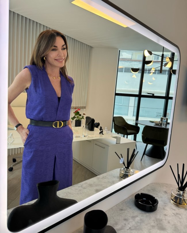 Στις φωτογραφίες είδαμε η παρουσιάστρια του TLive στον Alpha να ποζάρει φορώντας ένα μοβ φόρεμα μέσα στο ασπρόμαυρο γραφείο της.