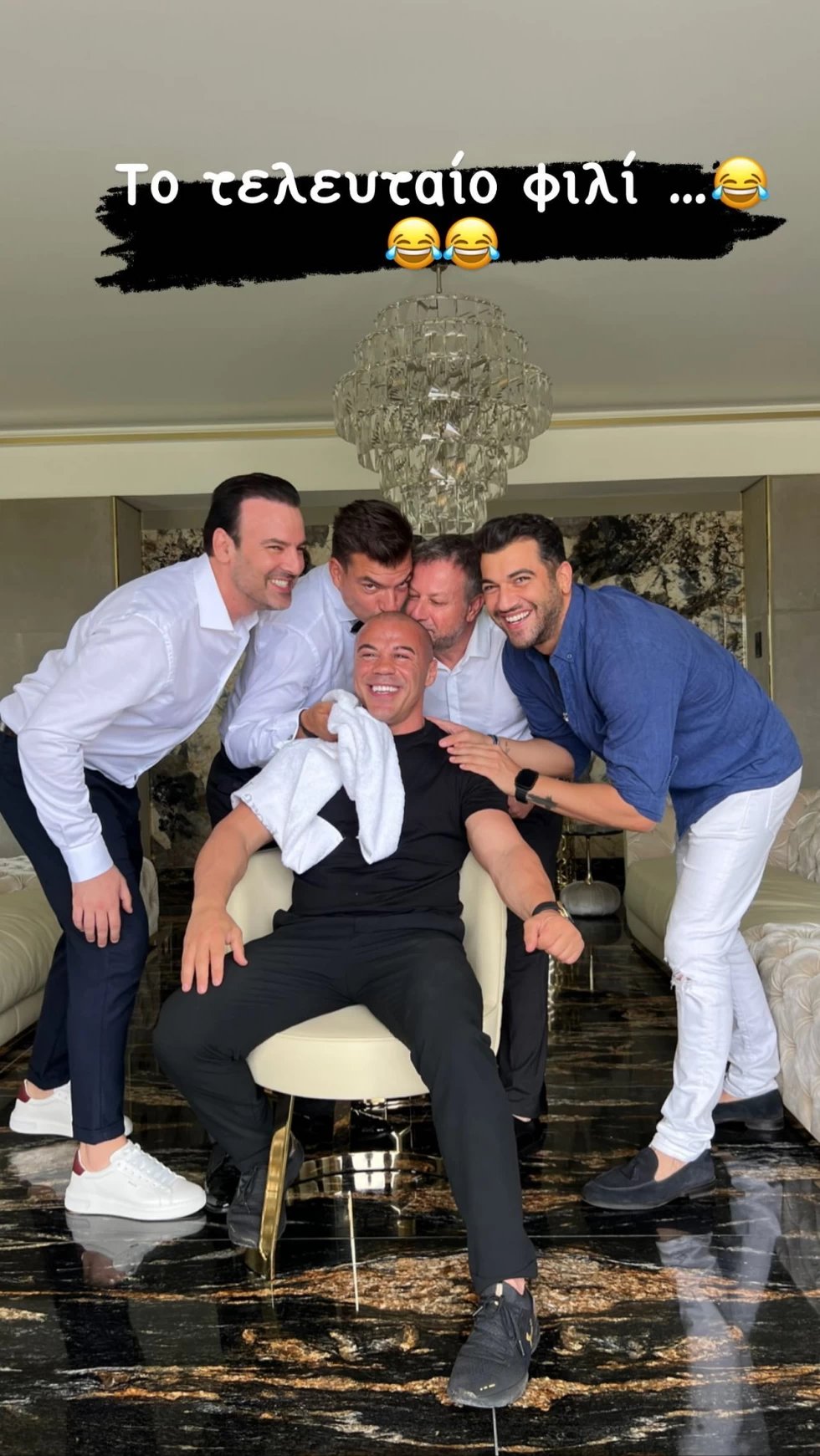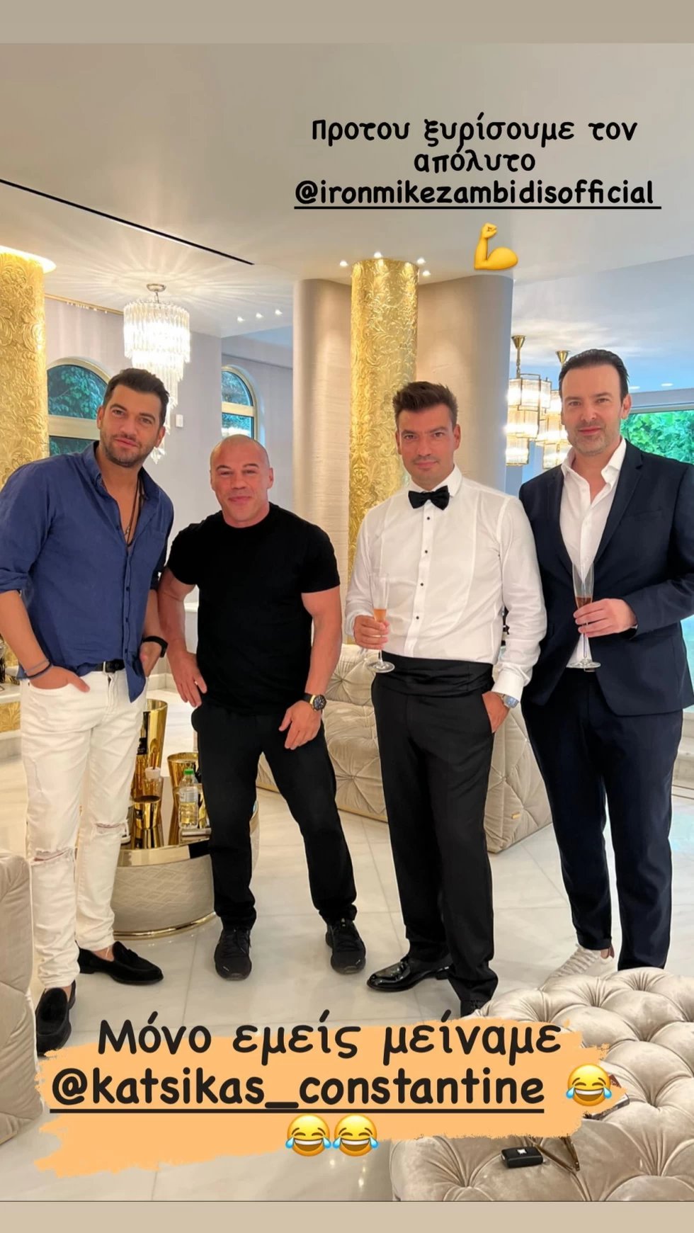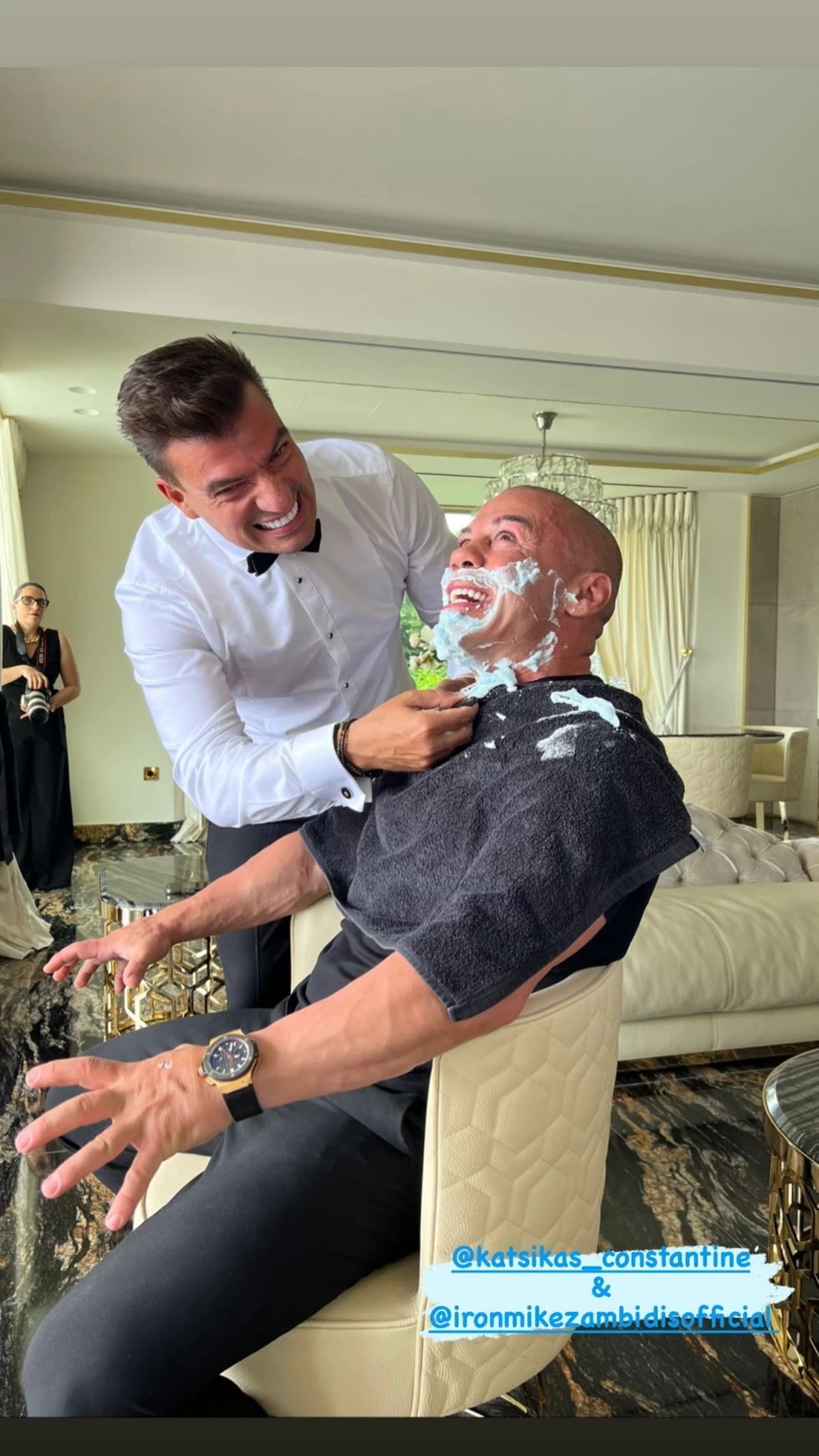 Από νωρίς οι φίλοι του Μιχάλη Ζαμπίδη ήταν στο πλευρό του για να τηρήσουν το έθιμο και να ξυρίσουν τον γαμπρό. Ανάμεσά τους ο Μάνος Ιωάννου, ο Κωνσταντίνος Κάτσικας, ο οποίος θα γίνει και κουμπάρος του Iron Mike, μαζί με τον Άμλετ Τουνιάν, αλλά και ο Διονύσης Πυλαρινός, ο οποίος παντρεύτηκε πρόσφατα.