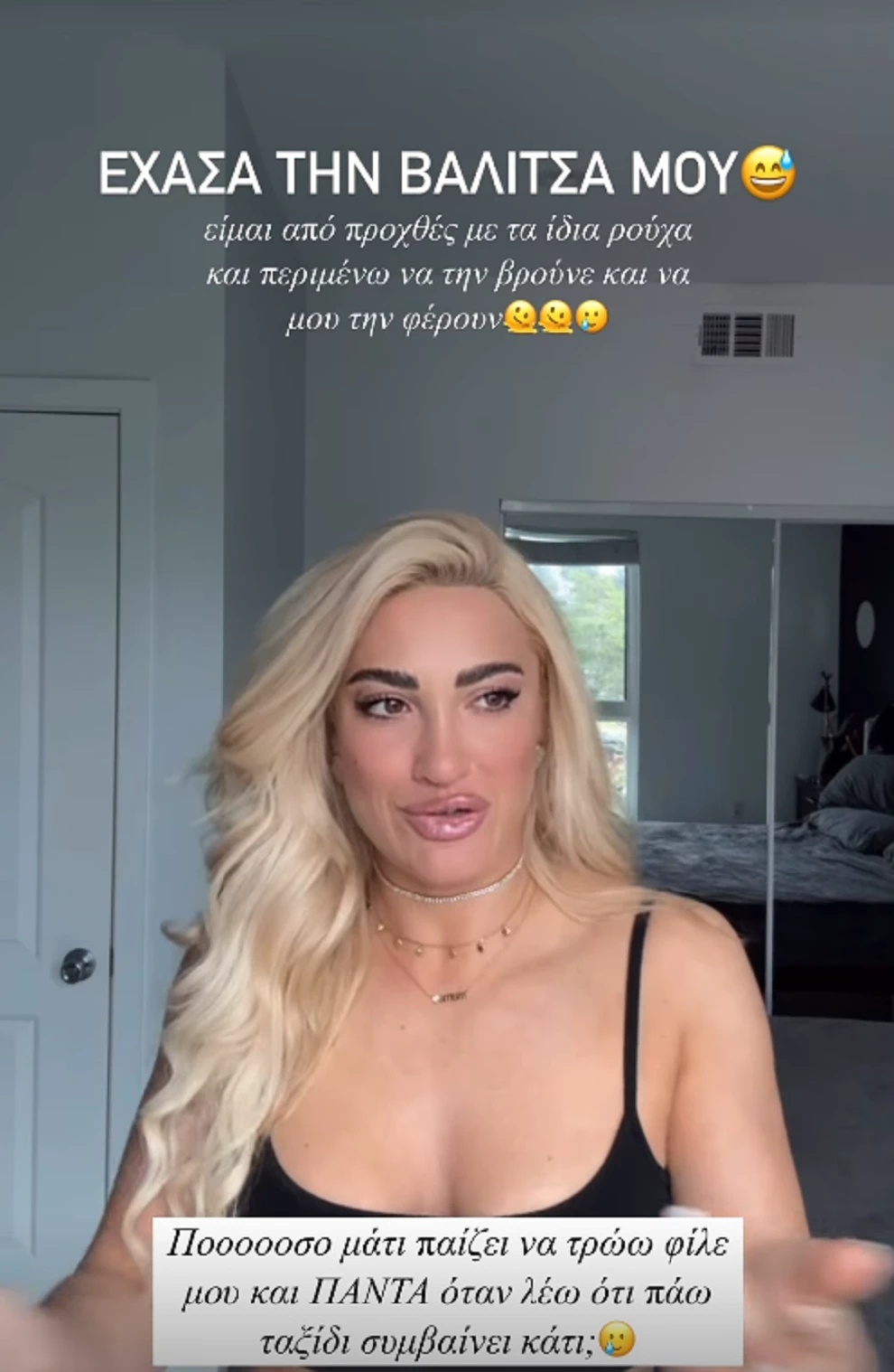 «Καλημέρα από το συννεφιασμένο Λος Άντζελες. Εχθές δεν έκανα story γιατί ήμουν νευριασμένη. Υπάρχει περίπτωση να πάω κάπου ταξίδι και να μην με φάνε ή να μην συμβούν τα χίλια μύρια; Άλλη φορά θα μπαίνω στο αεροπλάνο με θυμιατό. Έχασα τη βαλίτσα μου. Φοράω και τα ρούχα που φορούσα προχθές πριν πάω στην πτήση. Πάλι καλά που είχα στην τσάντα μου κάποια μακιγιάζ. Τώρα η φάση θα πήγαινε πλύνε βάλε, δεν ξέρω τι θα γίνει μ’ αυτή την κατάσταση».