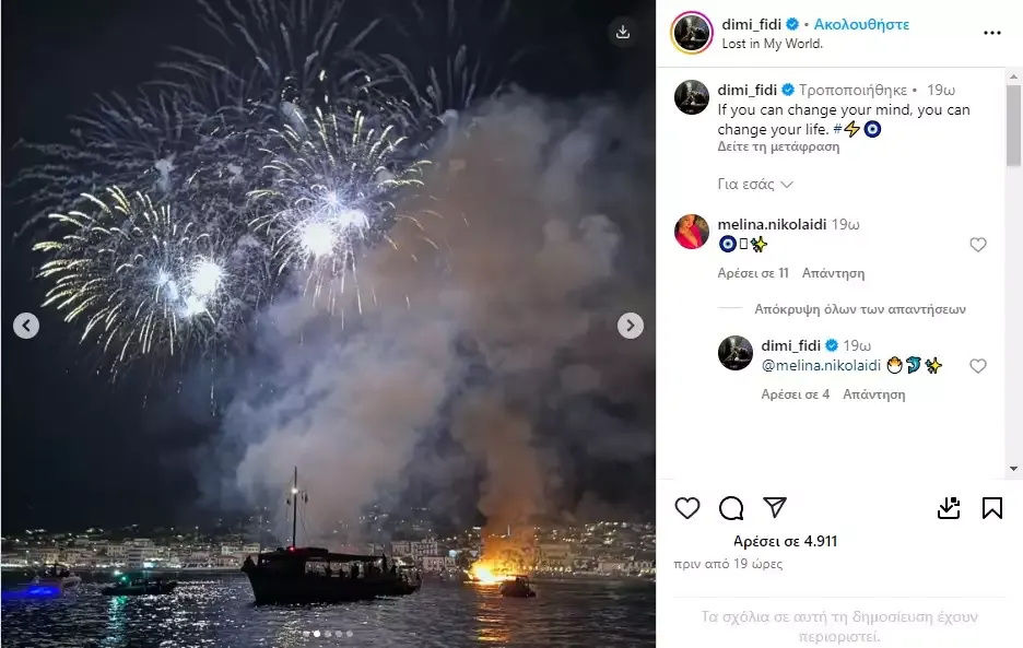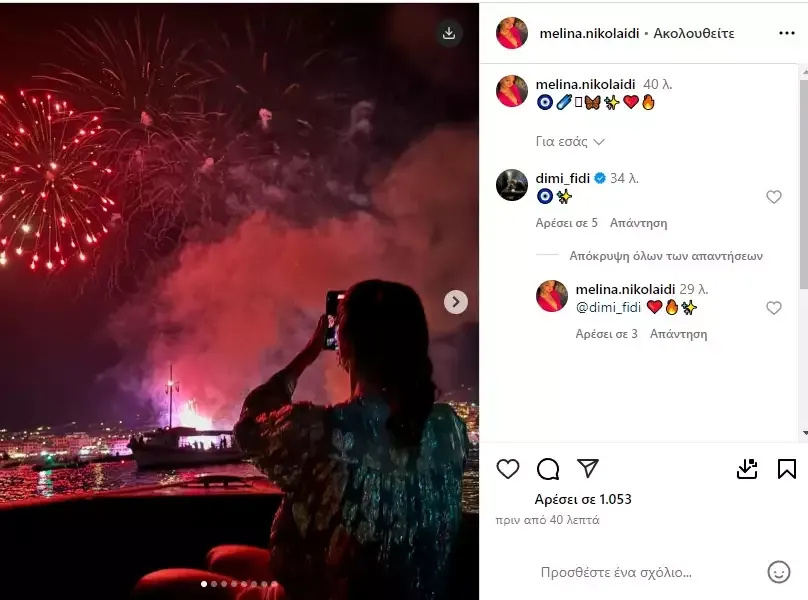 Τόσο ο Δημήτρης Φιντιρίκος όσο και η Μελίνα Νικολαΐδη μοιράστηκαν βίντεο και φωτογραφίες από την εξόρμησή τους στις Σπέτσες, με αφορμή το «κάψιμο της Αρμάτας» και δεν έμειναν μόνο εκεί, αλλά ο ένας σχολίασε την ανάρτηση του άλλου.