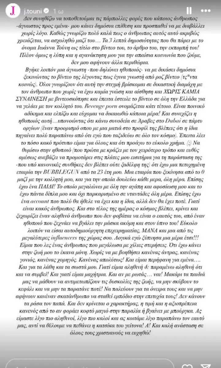 @j.touni Ας πιούμε λίγο τσάι… ☕️ να πούμε και καμία αλήθεια, γιατί από ψέματα και υποκρισία χορτάσαμε 🤢🤢 Δεν συνηθίζω να τοποθετούμαι τις πάμπολλες φορές που κάποιος άνθρωπος -άγνωστος προς εμένα- μου κάνει δημόσια επίθεση και προσπαθεί να με διαβάλλει χωρίς λόγο. Καθώς γνωρίζω πολύ καλά πως ο άνθρωπος αυτός αυτό ακριβώς χρειάζεται, να ασχοληθώ μαζί του… Τα 3 λεπτά δημοσιότητας που θα πάρει με το όνομα Ιωάννα Τούνη ως τίτλο στο βίντεο του, το άρθρο του, την εκπομπή του! Πλέον όμως η λύπη και η αγανάκτηση μου για την απαίσια κοινωνία που ζούμε, δεν μου αφήνουν άλλα περιθώρια. Βγήκε λοιπόν μια άγνωστη -που δηλώνει ηθοποιός- να με δικάσει δημόσια ξεκινώντας το βίντεο της λέγοντας πως έγινα γνωστή από ροζ βίντεο (τς*ντα κοινώς). Όλοι γνωρίζουν ότι αυτή την στιγμή βρίσκομαι σε δικαστική διαμάχη με τον άνθρωπο που χωρίς να έχω καμία γνώση και αίσθηση και ΧΩΡΙΣ ΚΑΜΙΑ ΣΥΝΑΙΝΕΣΗ με βιντεοσκόπησε και έπειτα έστειλε το βίντεο σε όλη την Ελλάδα για να γελάει με τον κολλητό του. Revenge porn ονομάζεται κάτι τέτοιο. Είναι ποινικό αδίκημα και ελπίζω και εύχομαι να δικαιωθώ κάποια μέρα! Και συνεχίζει η ηθοποιός αυτή…υπονοώντας ότι κάνω συνοδεία σε Άραβες στο Dubai σε πάρτυ οργίων (έναν προορισμό οπου με μια ματιά στο προφίλ της βλέπεις ότι η ίδια πηγαίνει πολύ παραπάνω από ότι εγώ που ταξιδεύω σε όλο τον κόσμο). Έπειτα λέει το πόσο κακό πρότυπο είμαι για όλους και ότι προάγω το εύκολο χρήμα. (;) Να θυμίσω στην ηθοποιό (που πρώτα με κράζει με τον χειρότερο τρόπο και ευθύς αμέσως ανεβάζει να προμοτάρει στις πλάτες μου εισιτήρια για τη παράσταση της -που υπό κανονικές συνθήκες δεν βλέπει ούτε ξαδέλφη της) ότι έχω μια πετυχημένη εταιρία την BUBBLEGUN από τα 23 έτη μου. Μια εταιρία που ξεκίνησα από το 0 μαζί με την κολλητή μου, και για την οποία δουλεύω κάθε μερα, όλη μέρα. Επίσης έχω ένα ΠΑΙΔΙ! Το οποίο μεγαλώνω με όλη την αγάπη και αφοσίωση μου και το έχω πάντα δίπλα μου και όχι παρκαρισμένο σε νταντάδες όλη μέρα. Επίσης έχω ένα account που πολύ θα ήθελε να έχει και η ίδια, αλλά δεν θα έχει ποτέ. Γιατί είναι κακός άνθρωπος. Και στο τέλος της ημέρας ο κόσμος βλέπει, κρίνει και ξεχωρίζει έναν αληθινό άνθρωπο που δεν φοβάται να είναι ο εαυτός του, από έναν ηθοποιό που ξεχνάει να βγάλει την μάσκα ακόμη και στον ύπνο του! Εύκολο λοιπόν να είσαι αυτοδημιούργητη επιχειρηματίας, ΜΑΝΑ και μια από τις μεγαλύτερες influencers της χώρας σου. Λογικά εγώ ξύπνησα μια μέρα έτσι!!! Είμαι που λες ένας άνθρωπος που μεγάλωσα με χίλιες στερήσεις. Ότι έχω κάνει στην ζωή μου το έκανα μόνη. Χωρίς να με βοηθήσει κανένας άντρας, κανένας γονιός, κανένας χορηγός. Κανένας απολύτως! Και είμαι περήφανη για εμένα…. Και για τα λάθη και τα σωστά μου. Γιατί είμαι αληθινή & παραμένω αληθινή ότι και να συμβεί! Και γιατί είμαι μαχήτρια. Και αν με ρωτάς… ναι! Μακάρι τα παιδιά μας να μάθουν να αντιμετωπίζουν τις δυσκολίες της ζωής, να μην σκύβουν το κεφάλι και να μην τα παρατάνε ποτέ! Να παλεύουν για τα όνειρα τους και να μην αφήνουν κανέναν σκατάνθρωπο να σταθεί εμπόδιο στην επιτυχία τους! Δεν κάνουν τα ράσα τον παπά. Και δεν κρίνεται ο χαρακτήρας, η τιμή και η αξιοπρέπεια κανενός από το αν φοράει κοφτό μαγιό στην παραλία ή βγαίνει με μπούργκα. Ας είμαστε λίγο πιο αληθινοί, λίγο πιο καλοί και ας κοιτάμε λίγο παραπάνω τον εαυτό μας, αντί να θέλουμε να πεθάνει η κατσίκα του γείτονα! Α! Και καλή ανάσταση σε όλους τους χριστιανούς να ευχηθώ! 🫶🏻 #