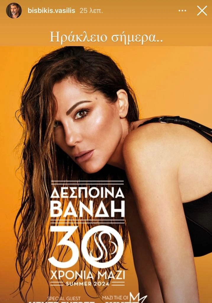 Η Δέσποινα Βανδή έχει σήμερα συναυλία στην Κρήτη και ο Βασίλης Μπισμπίκης έκανε μια ανάρτηση στον προσωπικό του λογαριασμό στο Instagram, δημοσιεύοντας την αφίσα και γράφοντας χαρακτηριστικά: «Ηράκλειο σήμερα».