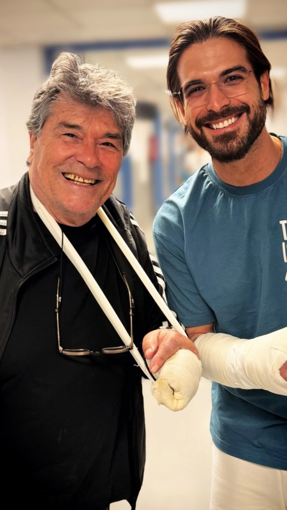 Η συνάντησή του με τον Πάνο Μιχαλόπουλο, ο οποίος επίσης είχε τραυματιστεί σε 3 δάχτυλα και επισκέφθηκε το ΚΑΤ για φροντίδα, κατέληξε σε μια κοινή χαμογελαστή φωτογραφία.