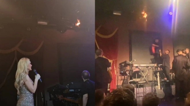 Πιο συγκεκριμένα την ώρα που οι 2 καλλιτέχνες τραγουδούσαν στη σκηνή, στο σημείο πίσω ακριβώς από την ορχήστρα ξέσπασε φωτιά στην οροφή από μια λάμπα. Όπως ήταν λογικό το πρόγραμμα διακόπηκε προκειμένου να δούνε τι θα έκαναν με τη φωτιά.