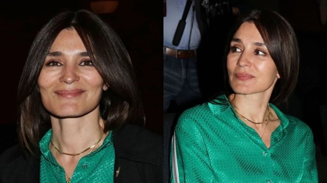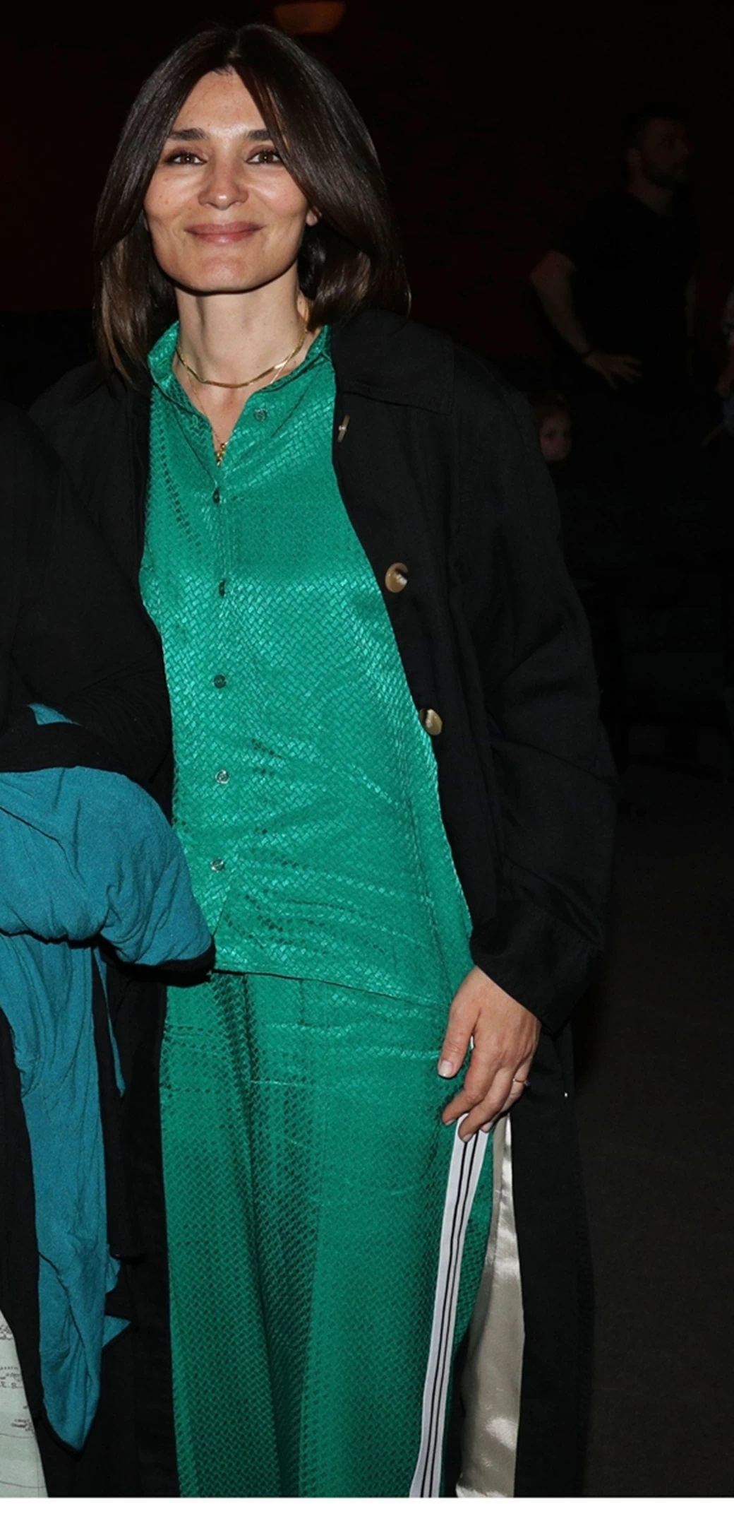 Η μελαχρινή ηθοποιός επέλεξε για την έξοδό της ένα luxury deux pieces που αποτελείται από φαρδύ πουκάμισο και παντελόνι σε loose γραμμή σε πράσινο χρώμα με ασπρόμαυρες ρίγες στο πλάι. Από πάνω φόρεσε ένα μακρύ μαύρο παλτό με σατέν φόδρα.