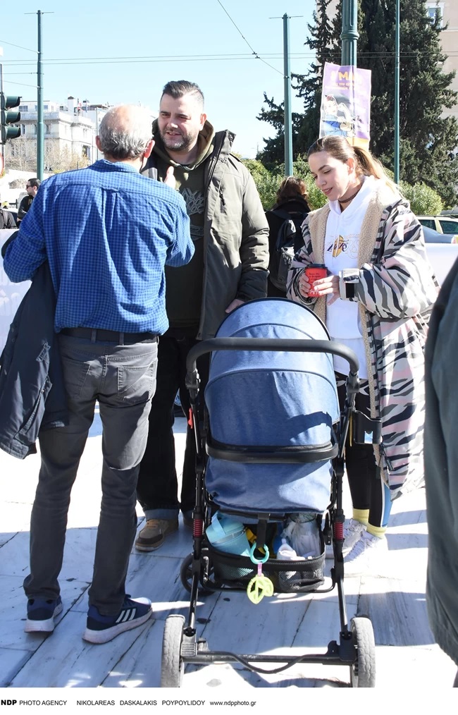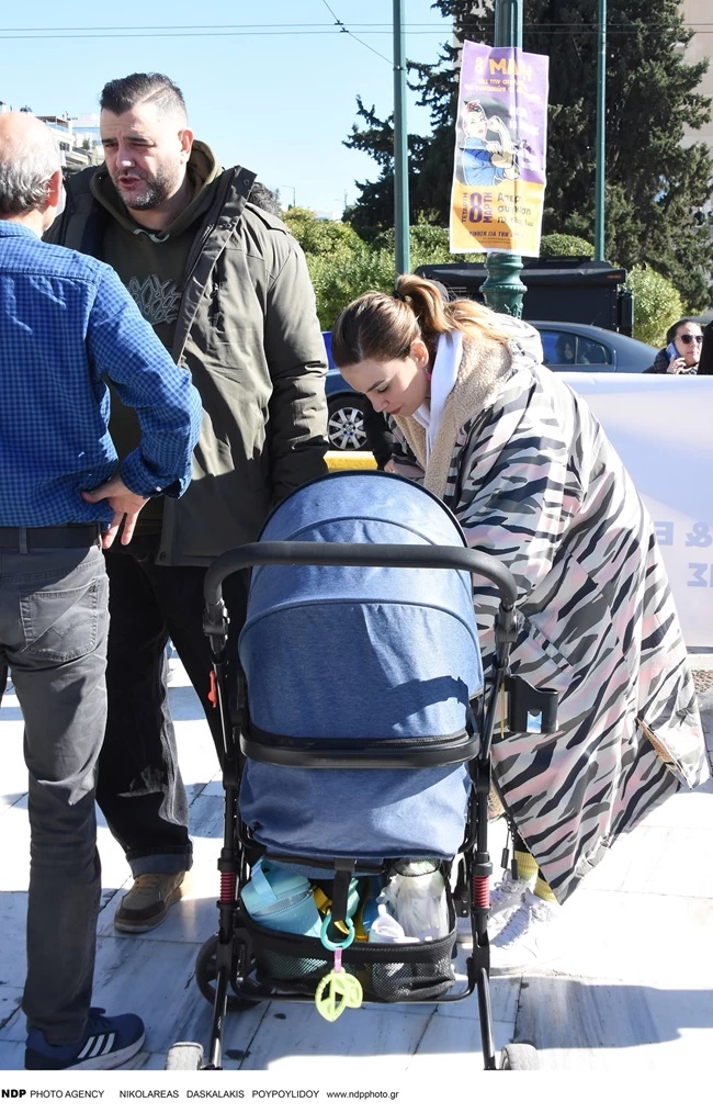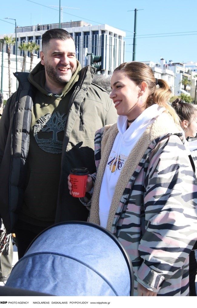 Στο κέντρο της Αθήνας βρέθηκε και η Κατερίνα Στικούδη, μαζί με τον σύζυγό της, Βαγγέλη Σερίφη, αλλά και τον 1,5 έτους γιο τους, Βύρωνα, τον οποίο είχαν σε παιδικό καροτσάκι.
