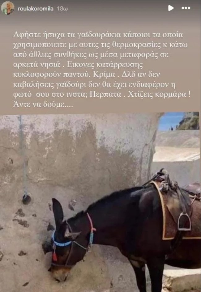 Σε ανάρτησή της λοιπόν στο Insta story, η Ρούλα Κορομηλά μοιράστηκε μια φωτογραφία ενός ταλαιπωρημένου ζώου που έχει ξαποστάσει για μια στιγμή σε μια σκιά, με την λεζάντα: “Αφήστε ήσυχα τα γαϊδουράκια κάποιοι τα οποία χρησιμοποιείται με αυτές τις θερμοκρασίες και κάτω από άθλιες συνθήκες ως μέσα μεταφοράς σε αρκετά νησιά”.