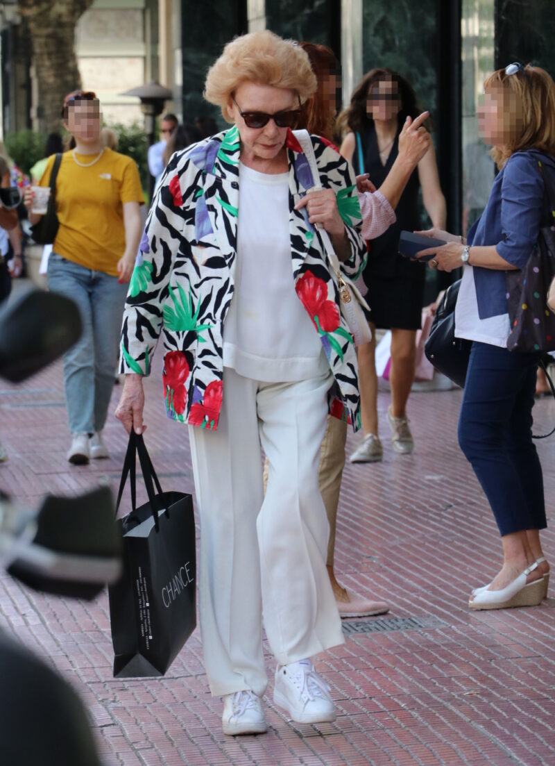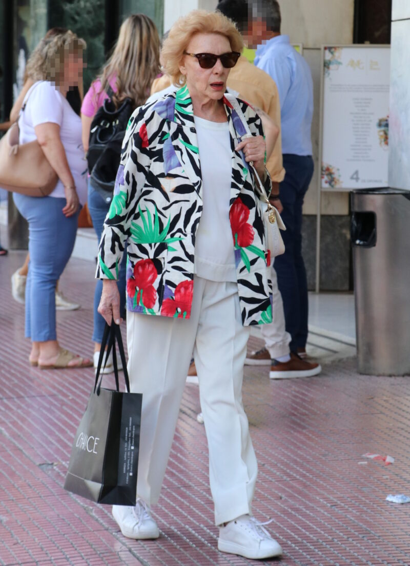 Η ηθοποιός η οποία και πριν 2 μέρες είχε τα γενέθλιά της και έκλεισε τα 89 της παραμένοντας πάντα εντυπωσιακή και κομψότατη. Όπως ακριβώς και η πρόφατη εμφάνισισή της στο κέντρο της Αθήνας όπου και έκανε τα ψώνια της και την “συνέλαβε” ο φωτογραφικός φακός. Η μεγάλη κυρία του ελληνικού θεάτρου και κινηματογράφου απέδειξε ότι η ηλικία είναι απλά ένας αριθμός. Καθώς παραμένει όμορφη και κομψή , η στιλάτη ηθοποιός ήταν ντυμένη με total white σύνολο και σνίκερς, δίνοντας χρώμα στο outfit με το υπέροχο floral blazer που φόρεσε.