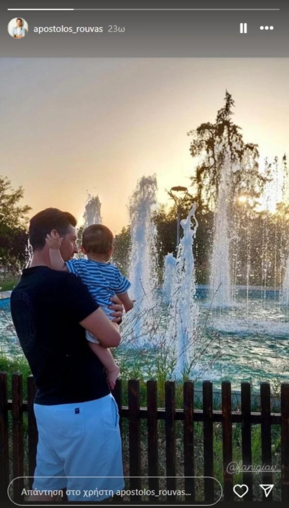 Τη Δευτέρα 3/6 ο Απόστολος Ρουβάς δημοσίευσε στο instagram μια σπάνια φωτογραφία μαζί με τον γιο του. Οι δύο τους είναι αγκαλιά σε μία από τις βόλτες του στη φύση χαζεύοντας τη δύση του ηλίου μπροστά από ένα συντριβάνι.