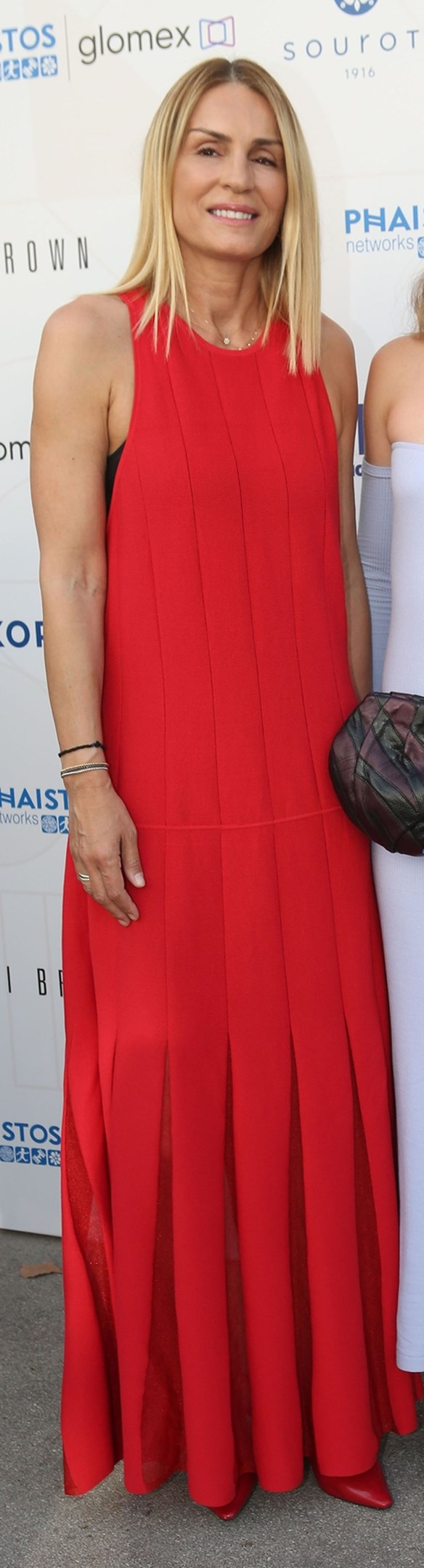 Πολύ κομψή στα κόκκινα ήταν η μαμά της Βάσω Στασινού. Η σύζυγος του Αντώνη Νικοπολίδη φόρεσε ένα αμάνικο κόκκινο φόρεμα με πτυχώσεις και διαφάνειες. Το συνδύασε με κόκκινες γόβες.