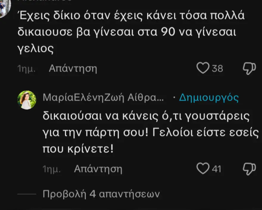 Σε ένα άλλο σχόλιο που έγραφε «εγώ νόμιζα ότι είναι η κοπέλα που τον προσέχει το γεροντάκι» απάντησε: «Ε ναι τον προσέχει, πάλι καλά».