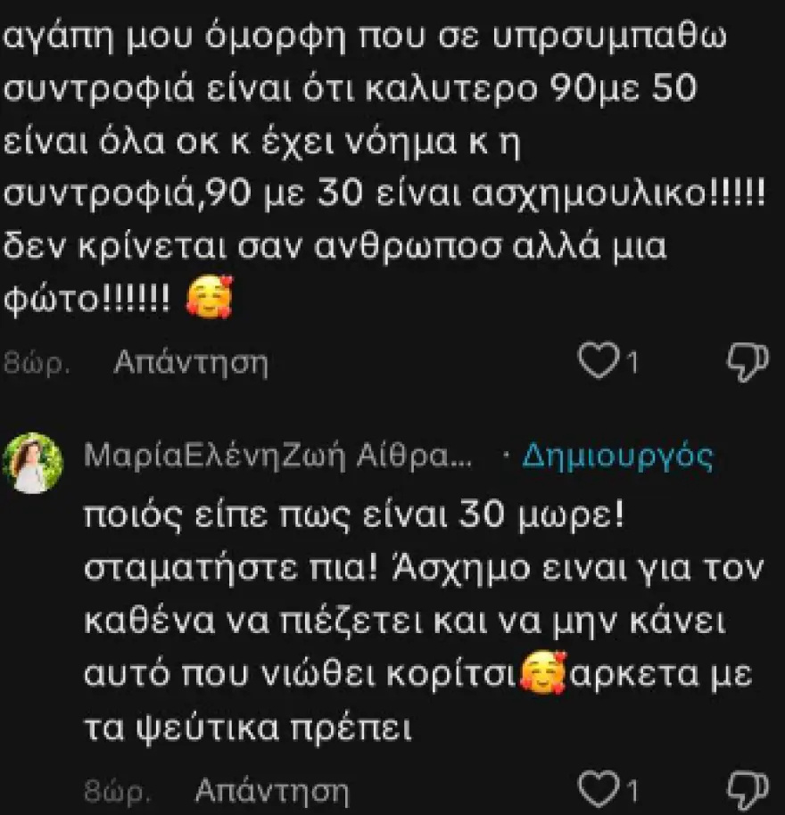 Μια ακόλουθός της που παρακολούθησε το βίντεο, της έγραψε: «Η συντροφιά είναι ό,τι καλύτερο, 90 με 50 είναι όλα οκ και έχει νόημα η συντροφιά, 90 με 30 είναι άσχημο. Δεν κρίνεται σαν άνθρωπος αλλά σαν φωτό».