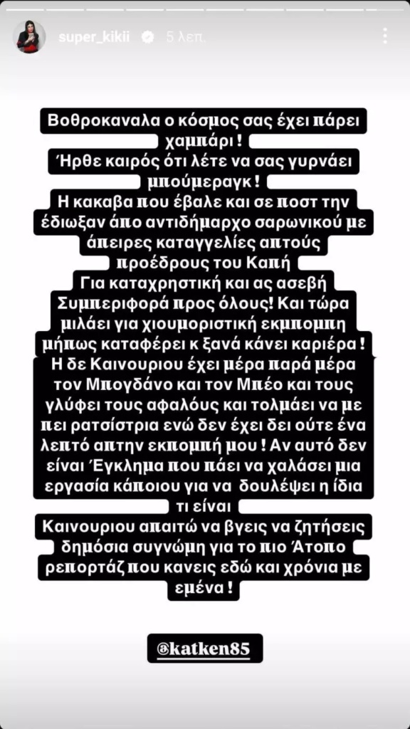 Καινούργιου απαιτώ να βγεις να ζητήσεις δημόσια συγγνώμη για το πιο άτοπο ρεπορτάζ που κάνεις εδώ και χρόνια με εμένα!» έγραψε η Super Κική.