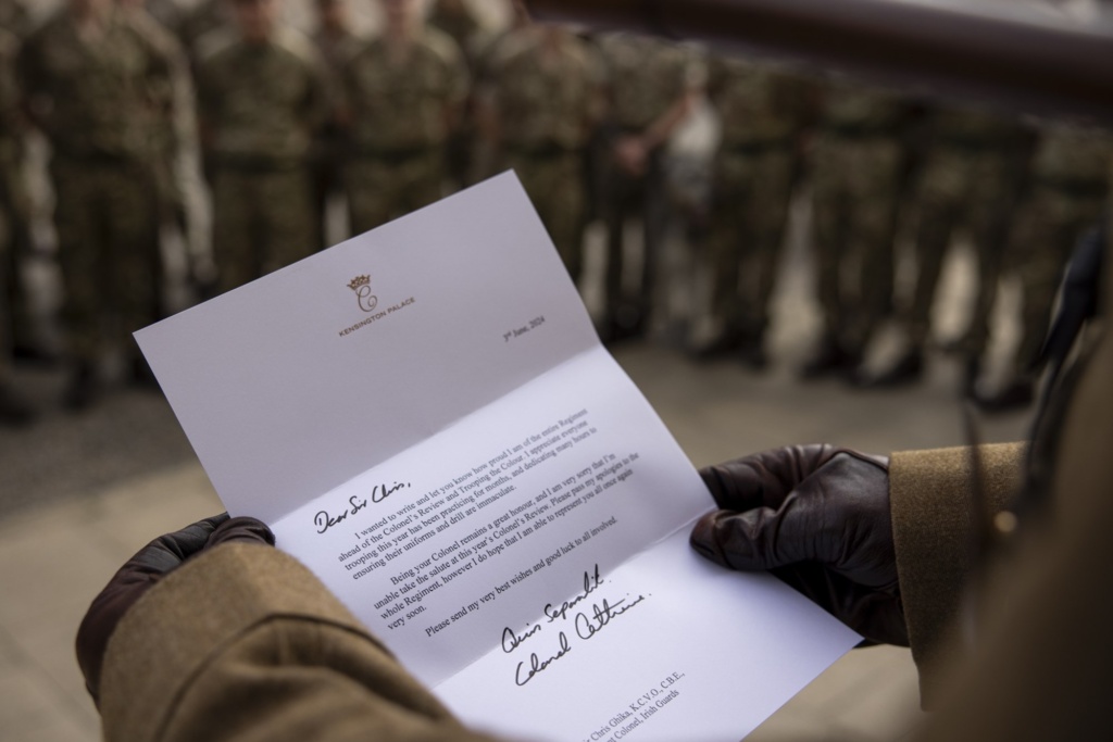 “Ήθελα να γράψω και να σας ενημερώσω πόσο περήφανη είμαι για ολόκληρο το Σύνταγμα ενόψει του Colonel’s Review και του Trooping the Colour. Εκτιμώ όλους όσους στρατιώτες φέτος εξασκήθηκαν για μήνες και αφιέρωσαν πολλές ώρες για να διασφαλίσουν ότι οι στολές και οι ασκήσεις τους είναι άψογες. Το να είμαι Συνταγματάρχης σας παραμένει μεγάλη τιμή και λυπάμαι πολύ που δεν μπορώ να κάνω τον χαιρετισμό στο φετινό Colonel’s Review. Σας παρακαλώ να μεταφέρετε τη συγγνώμη μου σε όλο το Σύνταγμα, ωστόσο, ελπίζω ότι θα μπορέσω να σας εκπροσωπήσω όλους άλλη φορά πολύ σύντομα”.