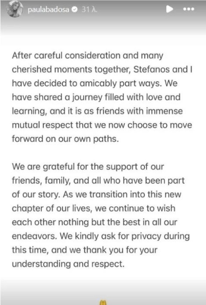 Η Πάολα Μπαντόσα έγραψε την περασμένη Κυριακή ότι αποφάσισε με τον Στέφανο Τσιτσιπά να χωρίσουν και ότι προχωρούν ως φίλοι, με σεβασμό ο ένας για τον άλλον, στα χωριστά μονοπάτια τους. Η τενίστρια ζήτησε από τον κόσμο να σεβαστεί την προσωπική της ζωή και ευχαρίστησε για την υποστήριξη τους φίλους και την οικογένειά της.
