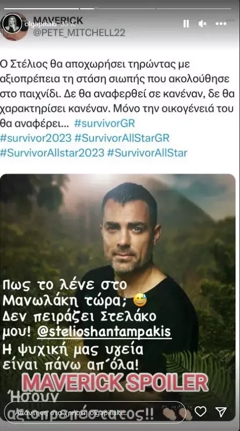 Το story της Όλγας Πηλιάκη λίγο πριν την ανακοίνωση του Στέλιου Χανταμπάκη