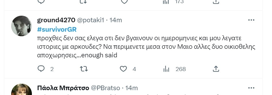 «Πώς το λένε στον Μανωλάκη τώρα; Δεν πειράζει Στελάκο μου! Η ψυχική μας υγεία είναι πάνω απ’ όλα! Ήσουν αξιοπρεπέστατος!», έγραψε χαρακτηριστικά.