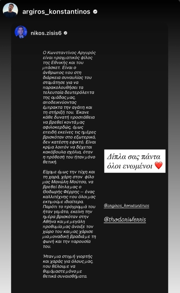 «Ο Κωνσταντίνος Αργυρός είναι πραγματικός φίλος της Εθνικής και του μπάσκετ. Είναι ο άνθρωπος που στη διάρκεια της συναυλίας του σταμάτησε για να παρακολουθήσει τα τελευταία δευτερόλεπτα της ομάδας μας αποδεικνύοντας έμπρακτα την αγάπη και τη στήριξή του. Έκανε κάθε δυνατή προσπάθεια να βρεθεί κοντά μας αφιλοκερδώς, όμως επειδή εκείνες της ημέρες βρισκόταν στο εξωτερικό, δεν κατέστη εφικτό. Είναι κρίμα λοιπόν να δέχεται κακόβουλα σχόλια όταν η πρόθεσή του ήταν μόνο θετική.