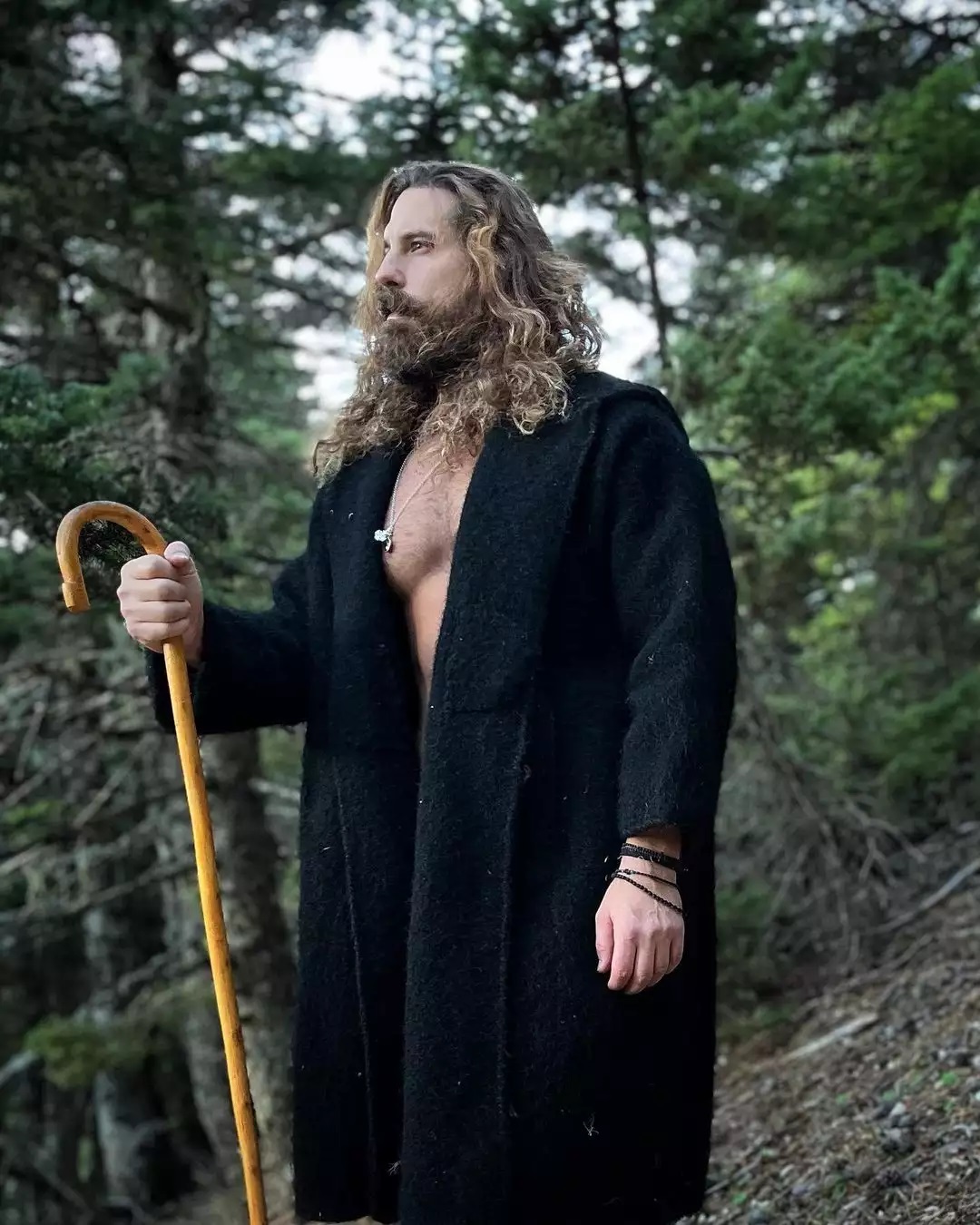Ο γνωστός επιχειρηματίας στη φωτογραφία ποζάρει σαν τσέλιγκας, με μακριά σγουρά μαλλιά, κρατώντας μια μαγκούρα, ενώ φοράει μόνο ένα μαύρο παλτό.