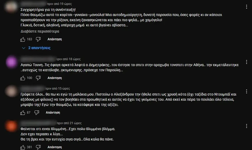 Την ίδια στιγμή, η Ιωάννα Τούνη έλαβε κύμα στήριξης από το κοινό. Την αποκάλεσαν «μανούλα-λιοντάρι», «γυναικάρα», «παράδειγμα γυναίκας» και «αυτοδημιούργητη». Άλλοι σχολίασαν: