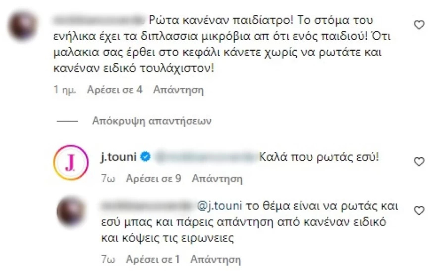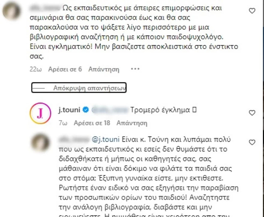 «Θα σας παρακαλούσα να το ψάξετε λίγο περισσότερο με μία βιβλιογραφική αναζήτηση ή με κάποιον παιδοψυχολόγο. Είναι εγκληματικό! Μην βασίζεστε αποκλειστικά στο ένστικτό σας», αναφέρει συγκεκριμένα follower της Ιωάννας Τούνη με εκείνη πάντως να μην πτοείται και να απαντάει με σαρκαστικό τόνο: «Τρομερό έγκλημα». Σε άλλο follower, που αντέτεινε ότι με αυτό τον τρόπο μπορεί να μεταφέρει μικρόβια στο παιδί της και της πρότεινε να ρωτήσει ειδικό, απάντησε εξίσου ειρωνικά: «Καλά που ρωτάς εσύ».