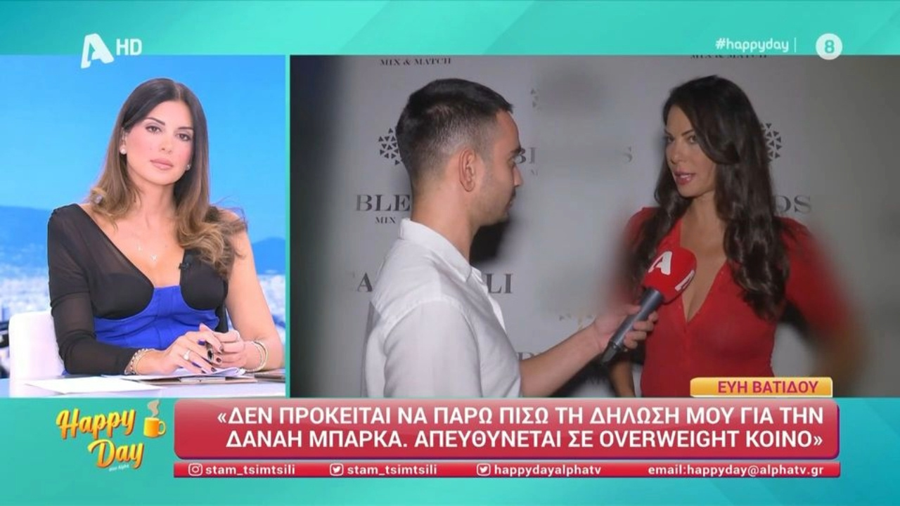 Δε νομίζω ότι η Δανάη Μπάρκα απευθύνεται σε κοινό που έχει να κάνει με κυρίες που είναι αδύνατες, όπως είμαι εγώ, και δεν την παρακολουθώ. Βεβαίως η συγκεκριμένη παρουσιάστρια θα μπορούσε να κάνει κι άλλα, πολύ ωραία πράγματα στη ζωή της πέρα από αυτό» είπε η Εύη Βατίδου στην κάμερα του Happy Day.