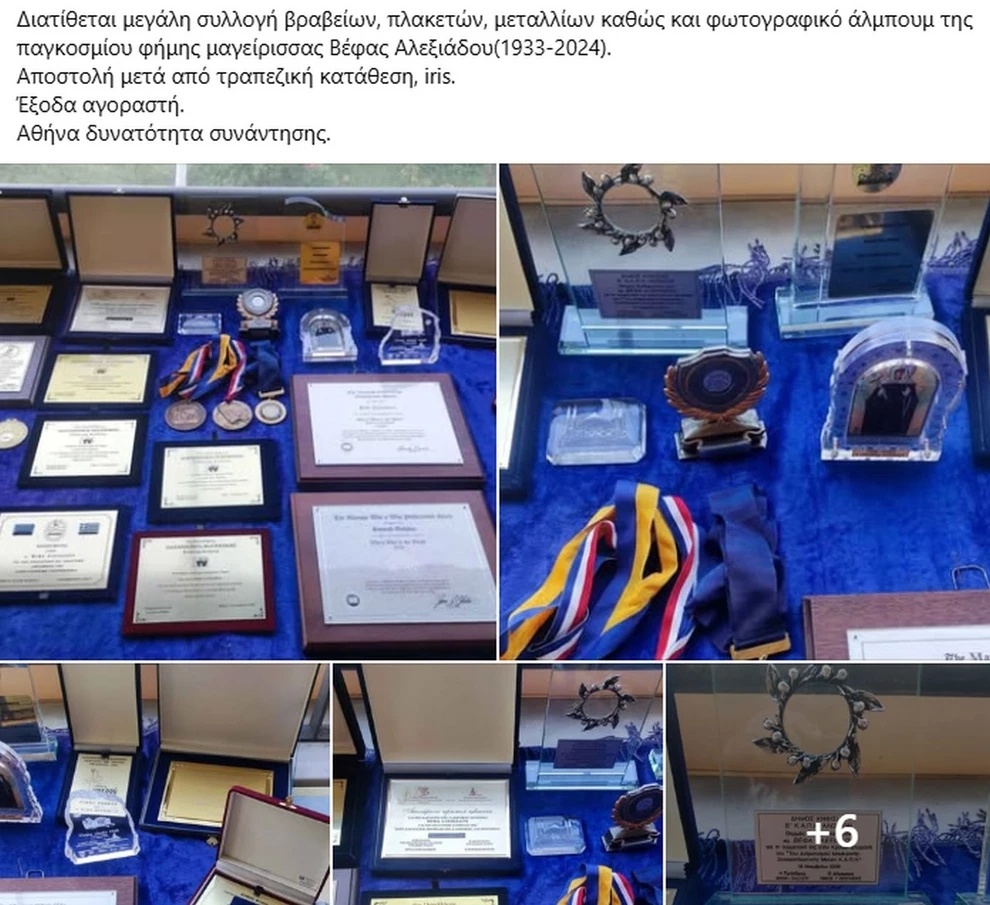 Ο πωλητής της συγκεκριμένης συλλογής που παρουσιάζεται μέσα από πολλές αναλυτικές φωτογραφίες, στο συνοδευτικό του κείμενο, μεταξύ άλλων, αναφέρει «διατίθεται μεγάλη συλλογή βραβείων, πλακετών, μεταλλίων καθώς και φωτογραφικό άλμπουμ της παγκοσμίου φήμης μαγείρισσας Βέφας Αλεξιάδου (1933-2024)».