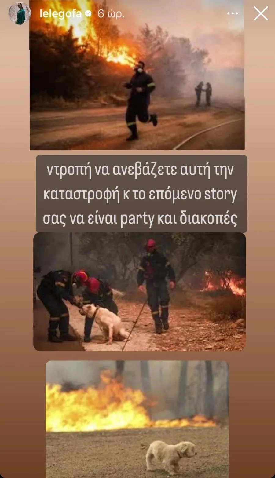 «Ντροπή να ανεβάζετε αυτήν την καταστροφή και το επόμενο στόρι σας να είναι πάρτι και διακοπές» έγραψε χαρακτηριστικά.