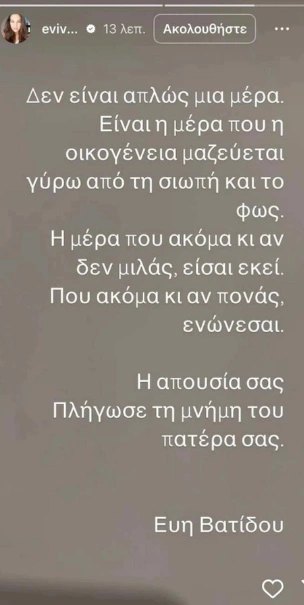 «Η απουσία σας… Πλήγωσε τη μνήμη του πατέρα σας. Και όμως, η σιωπή σας είναι η πιο δυνατή κραυγή… Ξέρω πως είναι δύσκολο, ξέρω πως σας πονάει. Μα η αλήθεια δεν χάνεται. Αυτός ο πόνος, κάποτε θα γίνει δύναμη», κατέληξε η Εύη Βατίδου, αφήνοντας ξεκάθαρες αιχμές για τα παιδιά της.