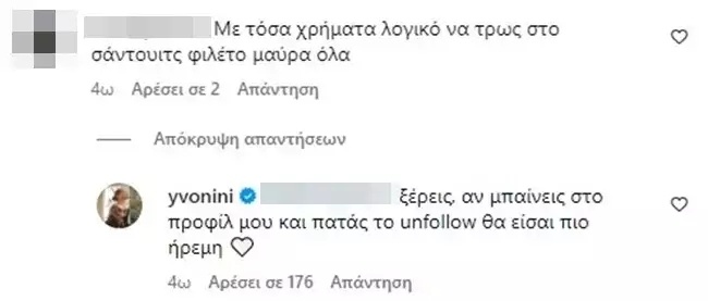 «Ξέρεις, αν μπαίνεις στο προφίλ μου και πατάς το unfollow θα είσαι πιο ήρεμη» ήταν η απάντηση που έδωσε η Υβόννη Μπόσνιακ.