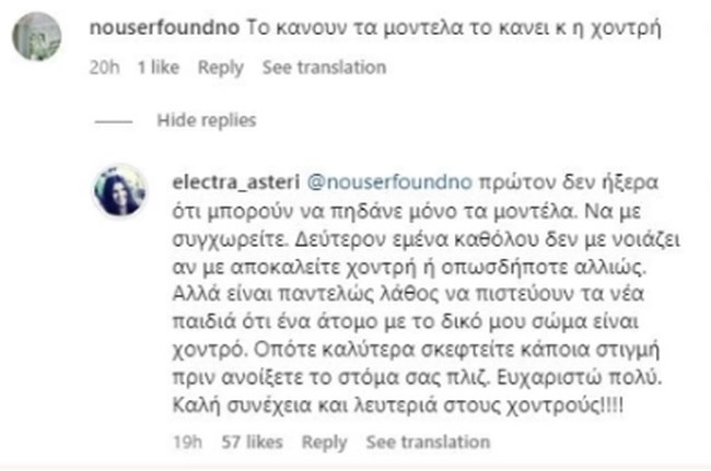 “Πρώτον δεν ήξερα ότι μπορούν να πηδάνε μόνο τα μοντέλα. Να με συγχωρείτε. Δεύτερον εμένα καθόλου δεν με νοιάζει αν με αποκαλείτε χοντρή ή οπωσδήποτε αλλιώς. Αλλά είναι παντελώς λάθος να πιστεύουν τα νέα παιδιά ότι ένα άτομο με το δικό μου σώμα είναι χοντρό. Οπότε καλύτερα σκεφτείτε κάποια στιγμή πριν ανοίξετε το στόμα σας πλιζ. Ευχαριστώ πολύ. Καλή συνέχεια και λευτεριά στους χοντρούς!!!!” ανέφερε χαρακτηριστικά.