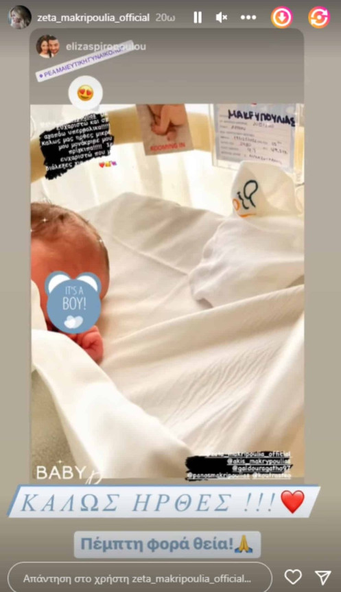 Αυτό μάλιστα είναι το 5ο ανιψάκι για τη Ζέτα Μακρυπούλια, η οποία έχει γίνει θεία και από τον άλλο αδελφό της, τον Πάνο Μακρυπούλια.