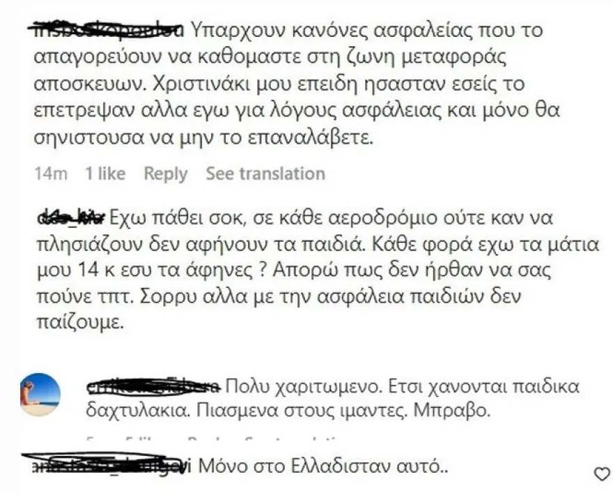 Σωρεία αρνητικών σχολίων δέχτηκε η σύζυγος του Σάκη Τανιμανίδη, Χριστίνα Μπόμπα για τις κόρες της που τις είχε βάλει πάνω σε έναν υμάντα αεροδιάδρομου, και έκανε τις πρώτες της δηλώσεις σχετικά με το βίντεο στο Instagram της. Η ίδια απολογήθηκε και είπε πως δεν το γνώριζε ότι απαγορεύεται αλλιώς δεν θα το είχε κάνει.