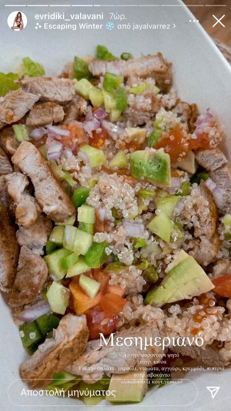 Η Ευρυδίκη Βαλαβάνη είναι λάτρης της υγιεινής διατροφής και μπορεί εύκολα να αλλάξει τις συνήθειες της και να μπει σε πρόγραμμα όποτε θέλει να χάσει βάρος.