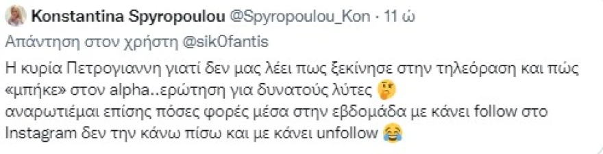 Η παρουσιάστρια που σε λίγο καιρό αναμένεται να φέρει στον κόσμο το πρώτο της παιδί έγραψε: «Η κυρία Πετρογιάννη γιατί δεν μας λέει πώς ξεκίνησε στην τηλεόραση και πώς μπήκε στον Alpha..ερώτηση για δυνατούς λύτες. Αναρωτιέμαι επίσης πόσες φορές μέσα στην εβδομάδα με κάνει follow στο Instagram δεν την κάνω πίσω και με κάνει unfollow».