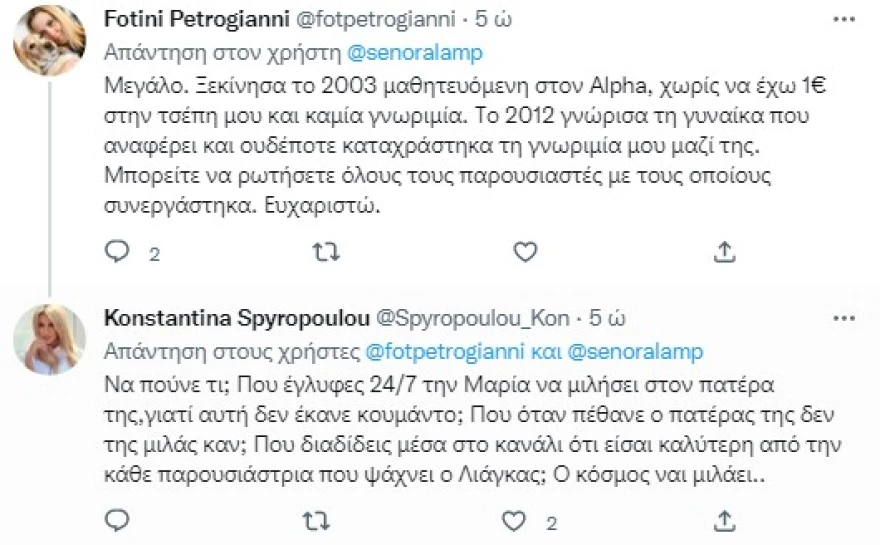 Με τη σειρά της η δημοσιογράφος έγραψε στο νήμα του παραπάνω tweet: «Μεγάλο. Ξεκίνησα το 2003 μαθητευόμενη στον Alpha, χωρίς να έχω 1 ευρώ στην τσέπη μου και καμία γνωριμία. Το 2012 γνώρισα τη γυναίκα που αναφέρει και ουδέποτε καταχράστηκα τη γνωριμία μου μαζί της. Μπορείτε να ρωτήσετε όλους τους παρουσιαστές με τους οποίους συνεργάστηκα. Ευχαριστώ».