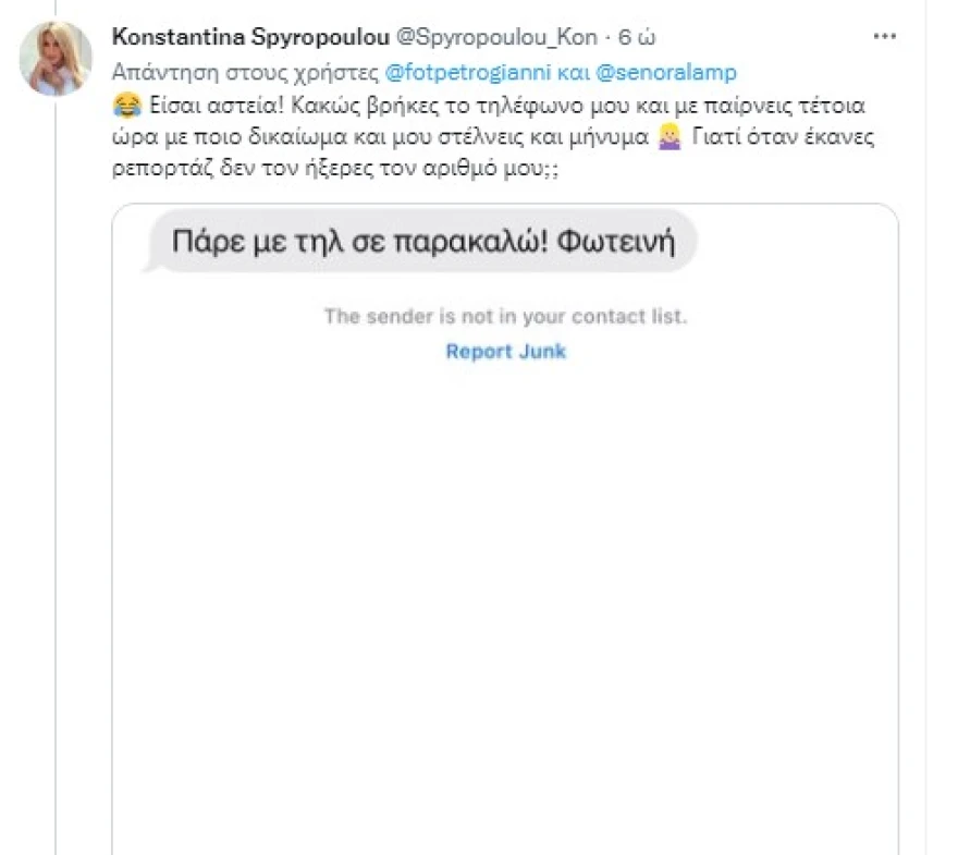 Στο tweet αυτό, εντελώς απρόσμενα απάντησε η Κωνσταντίνα Σπυροπούλου, η οποία παρά τα όσα ακούγονται τις τελευταίες ημέρες μετά τη συνέντευξή της στην Ελένη Μενεγάκη, παραμένει σιωπηλή.