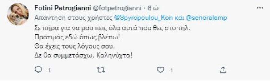 Η απάντηση από την Φωτεινή Πετρογιάννη δεν άργησε να έρθει όταν η δημοσιογράφος της είπε: «Κωνσταντίνα μου, ελπίζω να βρεις έστω και ΕΝΑΝ άνθρωπο να υποστηρίξει τα ψέματα που γράφεις. Καλό σου βράδυ».