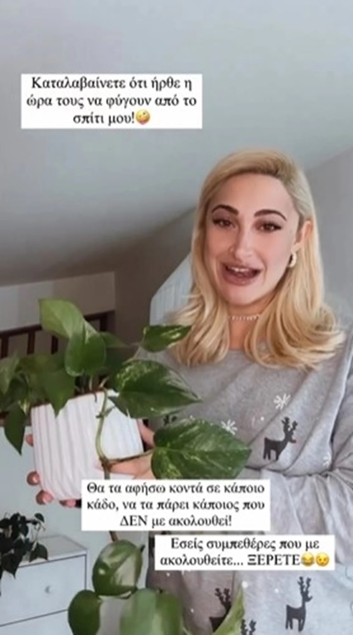 «Καταλαβαίνετε ότι ήρθε η ώρα τους να φύγουν από το σπίτι μου! Θα τα αφήσω κοντά σε κάποιο κάδο, να τα πάρει κάποιος που ΔΕΝ με ακολουθεί! Εσείς συμπεθέρες που με ακολουθείτε… ΞΕΡΕΤΕ!»