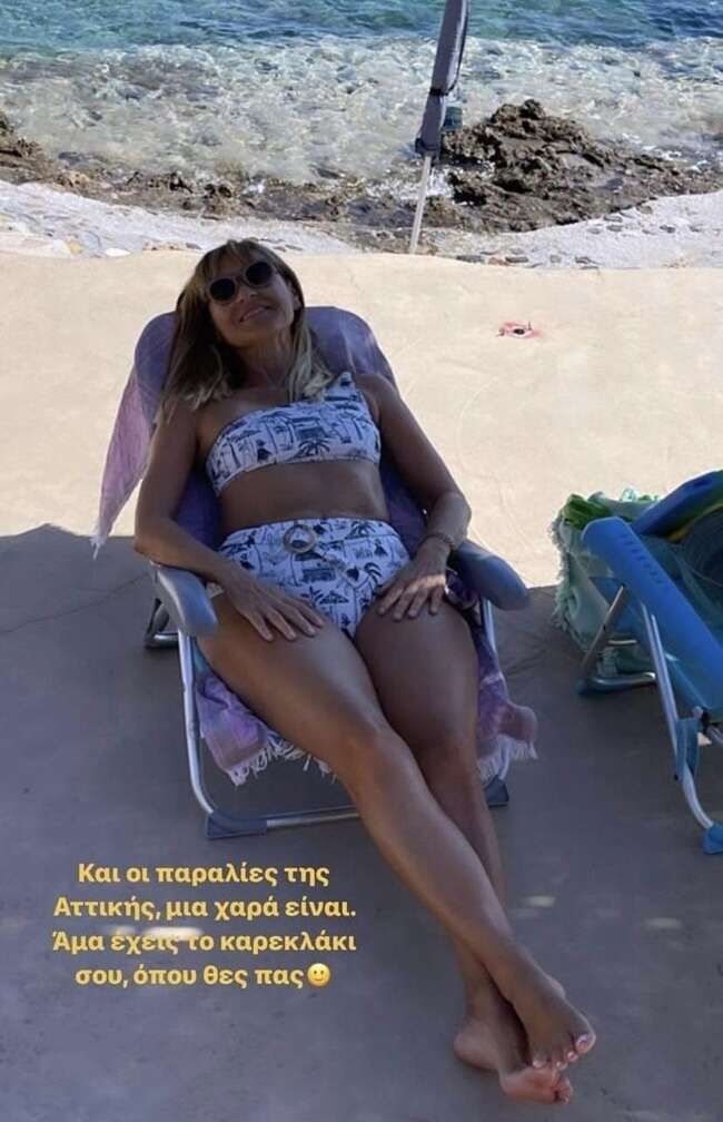 Πιο αναλυτικά, η γνωστή δημοσιογράφος ανήρτησε μία φωτογραφία στην οποία απεικονίζεται χαρούμενη δίπλα στο κύμα. Γυμνασμένη και stylish απόλαυσε τη θάλασσα με το καρεκλάκι της πάντα μαζί. Μάλιστα, σε παλαιότερη δημοσίευση, η ίδια είχε παραδεχτεί πως το μόνο που χρειάζεται στις διακοπές της είναι αυτό το καρεκλάκι. Έτσι και η ίδια έγραψε με χιούμορ πως “Και οι παραλίες της Αττικής, μια χαρά είναι. Άμα έχεις το καρεκλάκι σου, όπου θες πας”.