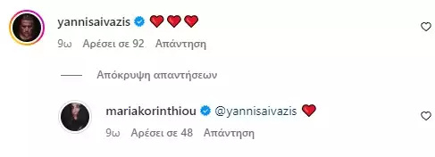 Τα σχόλια κάτω από την ανάρτηση αυτή ήταν πολλά. Εκείνο όμως που ξεχωρίζει είναι αυτό του Γιάννη Αϊβάζη, ο οποίος πρόσθεσε τρεις κόκκινες καρδιές με τη Μαρία Κορινθίου να του απαντά με μια επίσης κόκκινη καρδιά.