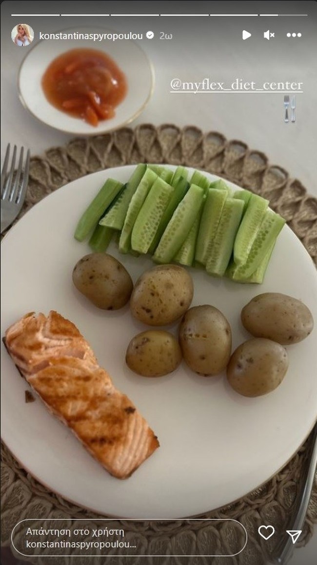 Όπως θα διαπιστώσετε και εσείς από την ανάρτησή της, το γεύμα της περιλαμβάνει σολωμό συνοδευόμενο από baby πατάτες βραστές, αγγούρι και μια γλυκόξινη σάλτσα. Γεύμα χαμηλό σε θερμίδες και υψηλό σε πρωτεΐνη και σίγουρα ελαφρύ.