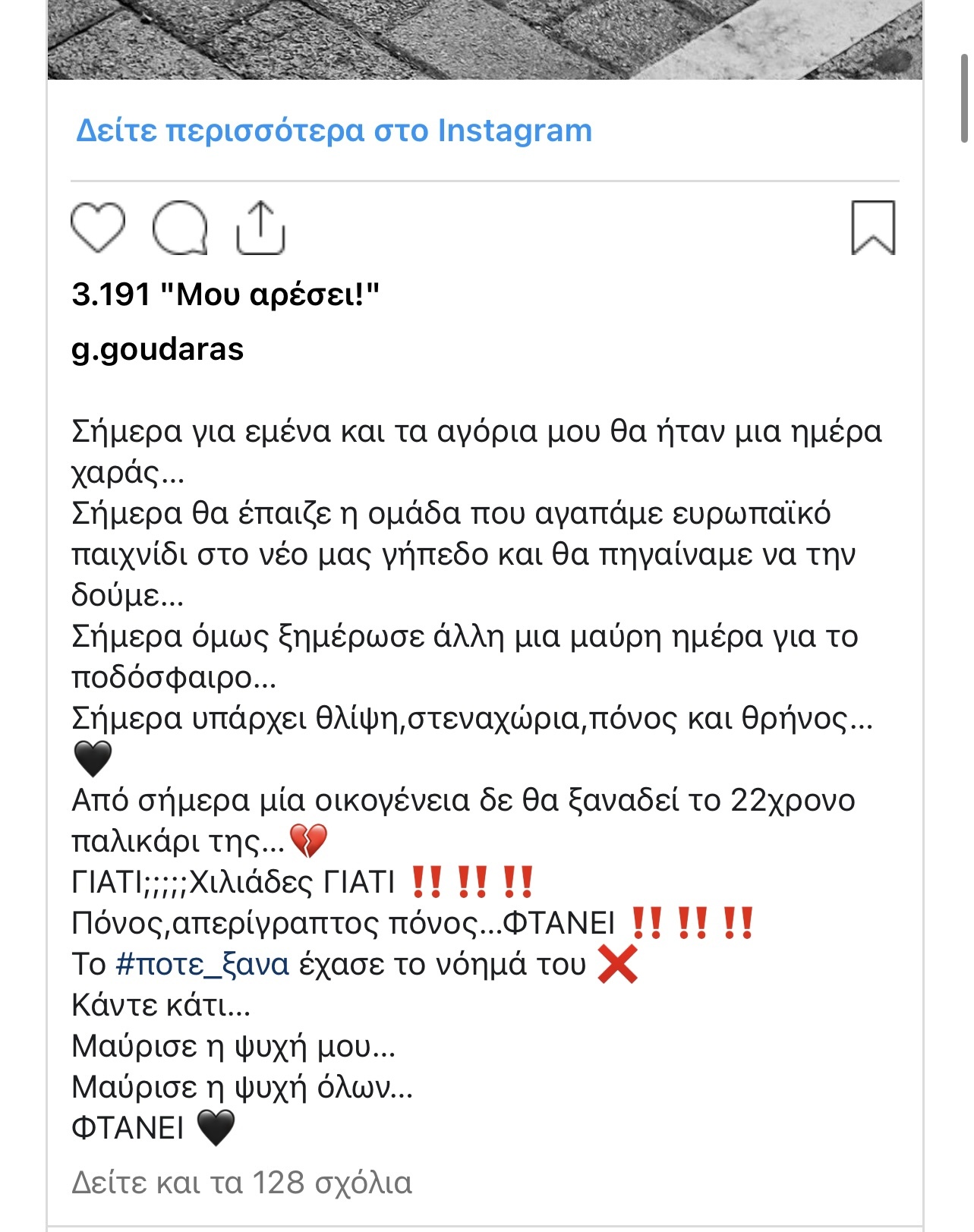 Χιλιάδες γιατί; Πόνος, απερίγραπτος πόνος…φτάνει. Το Ποτέ Ξανά έχασε το νόημά του Κάντε κάτι… Μαύρισε η ψυχή μου… Μαύρισε η ψυχή όλων…φτάνει», έγραψε ο Γρηγόρης Γκουντάρας στην ανάρτησή του.
