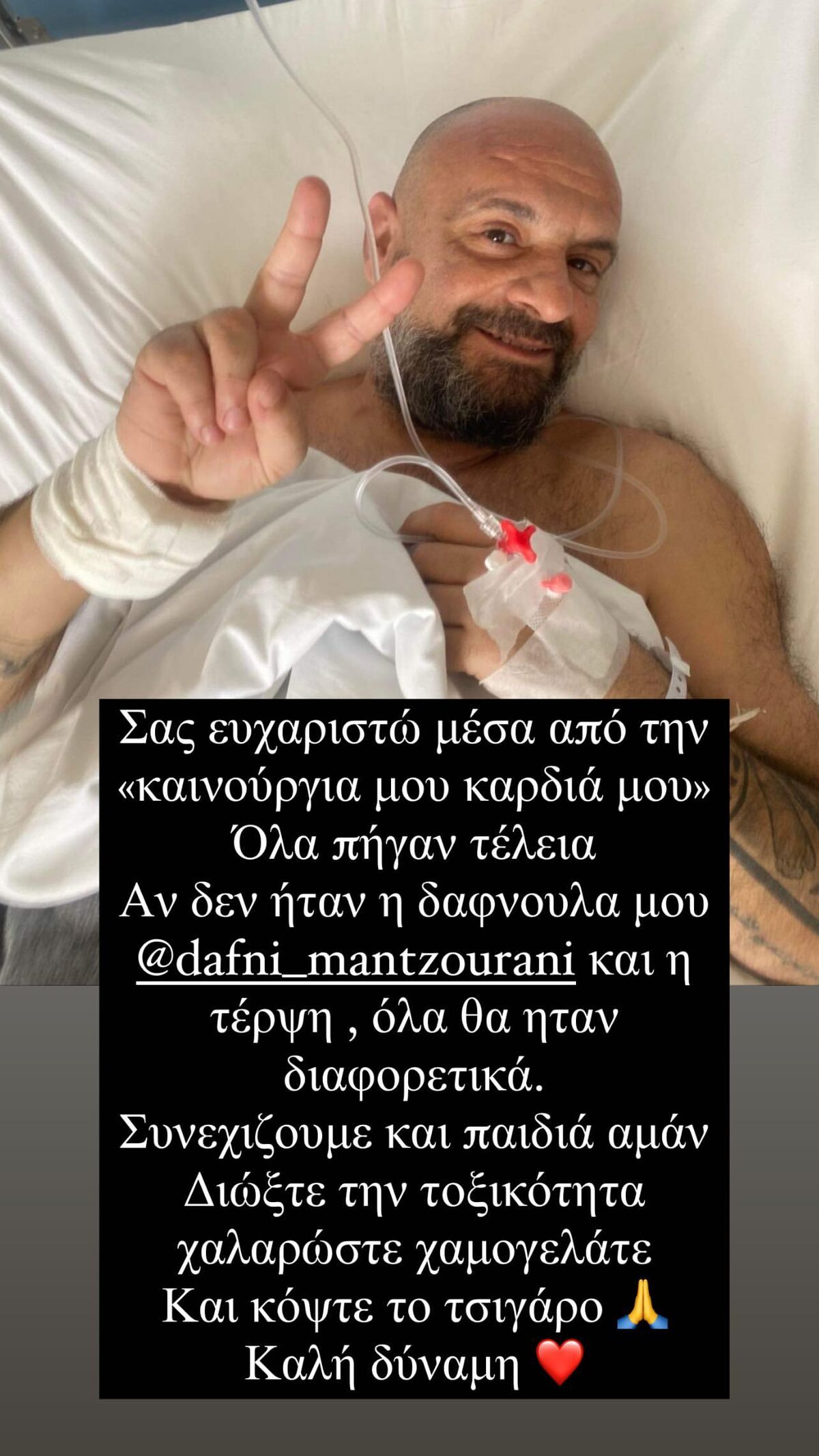 «Σας ευχαριστώ μέσα από την “καινούργια μου καρδιά”. Όλα πήγαν τέλεια. Αν δεν ήταν η Δαφνούλα μου και η τέρψη, όλα θα ήταν διαφορετικά. Συνεχίζουμε και παιδιά αμάν, διώξτε την τοξικότητα, χαλαρώστε και χαμογελάτε. Και κόψτε το τσιγάρο, καλή δύναμη», έγραψε ο Γρηγόρης Μπάκας.