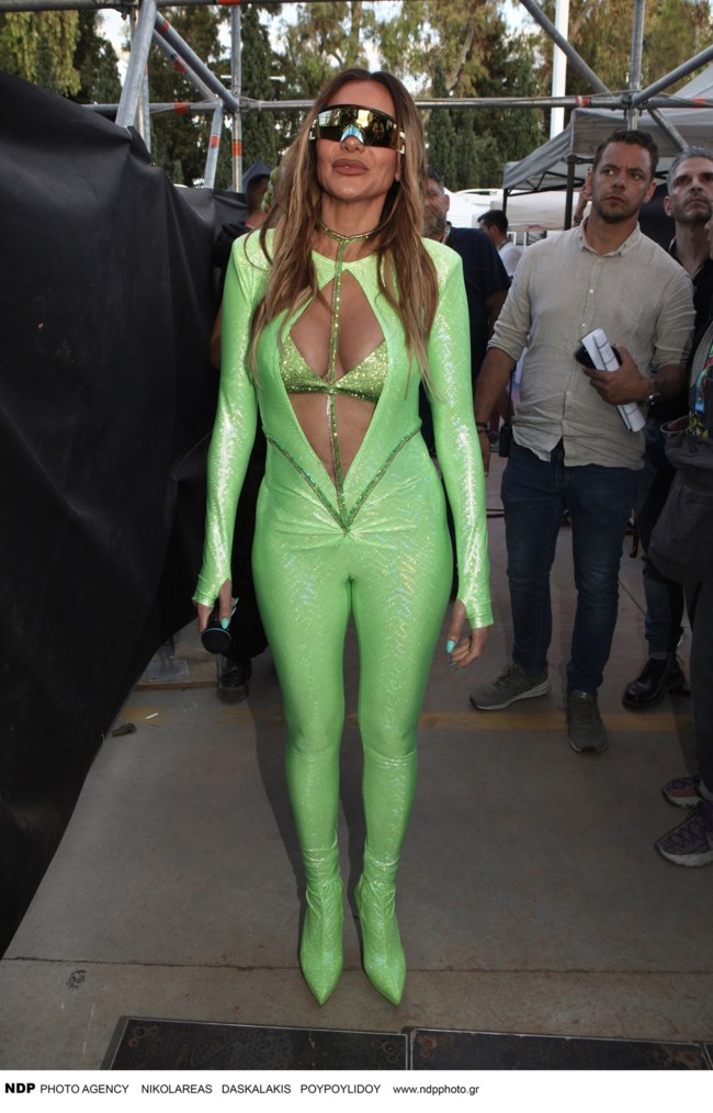 Ειδικότερα, η τραγουδίστρια φόρεσε μια neοn ολόσωμη φόρμα, με άνοιγμα στο στήθος και glam bra top στο ίδιο χρώμα, με την υπογραφή της Celia Kritharioti και ολοκλήρωσε την εμφάνισή της της με τεράστια γυαλιά ηλίου και νύχια σε τιρκουάζ χρώμα.